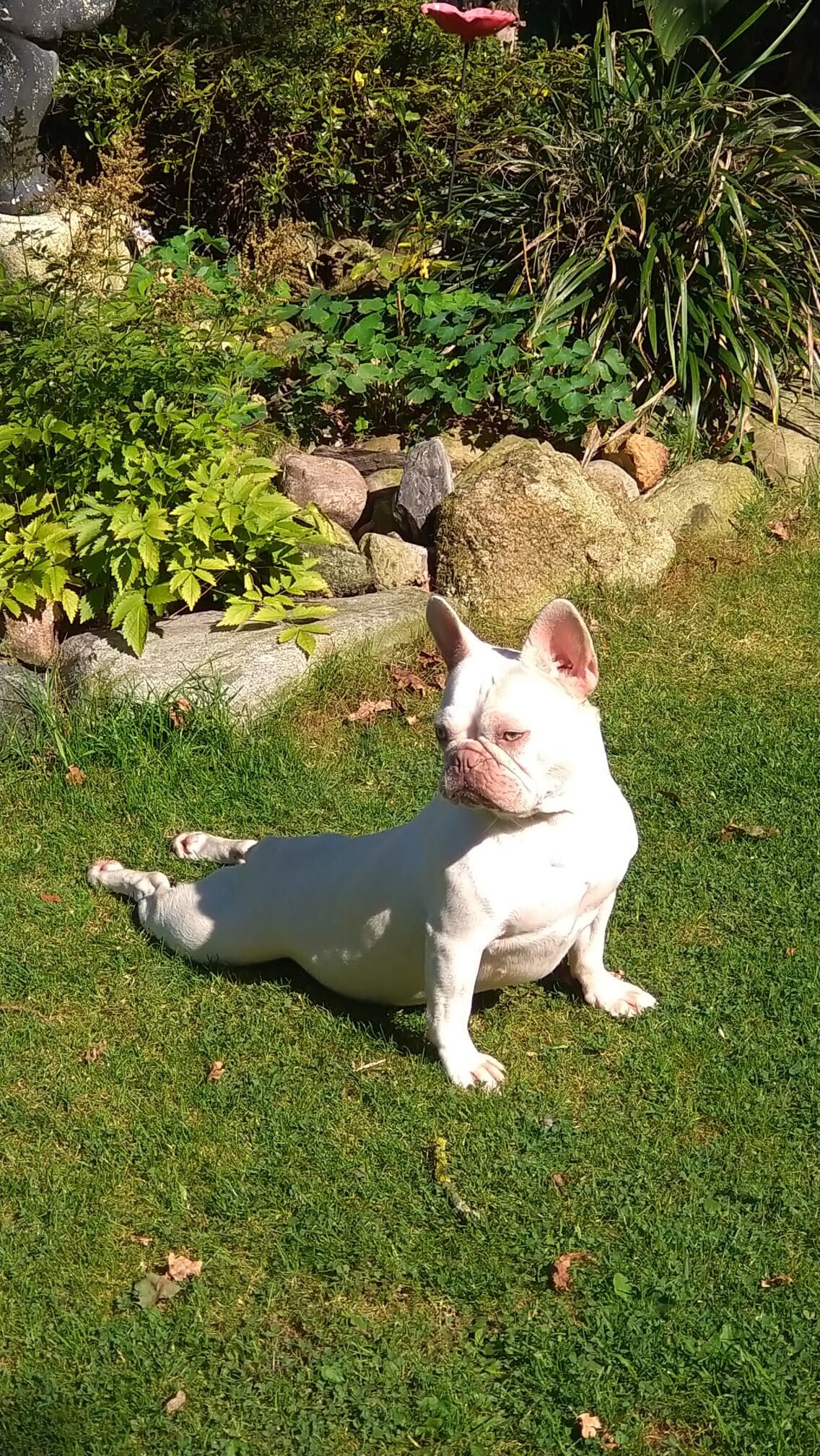 "Wist je dat Franse Buldoggen kampioenen zijn in stretchen? 🦴 Omdat ze zo gespierd en compact gebouwd zijn, helpt het ze om flexibel te blijven. Bovendien ziet die 'sploot' (met de achterpootjes plat naar achteren) er simpelweg onweerstaanbaar uit. Krabben over de rug tijdens het strekken is natuurlijk verplicht! 🐾❤️"